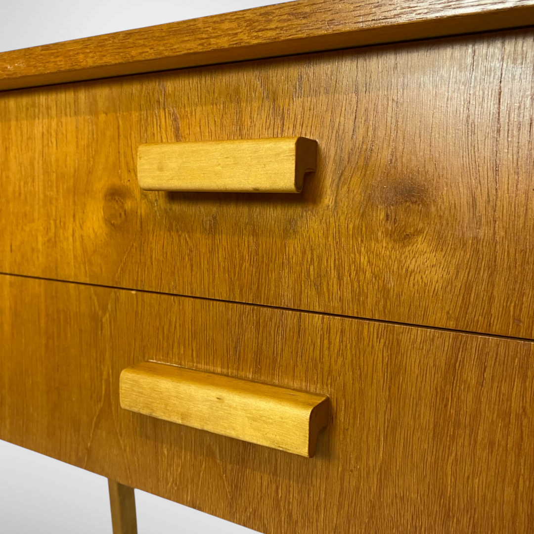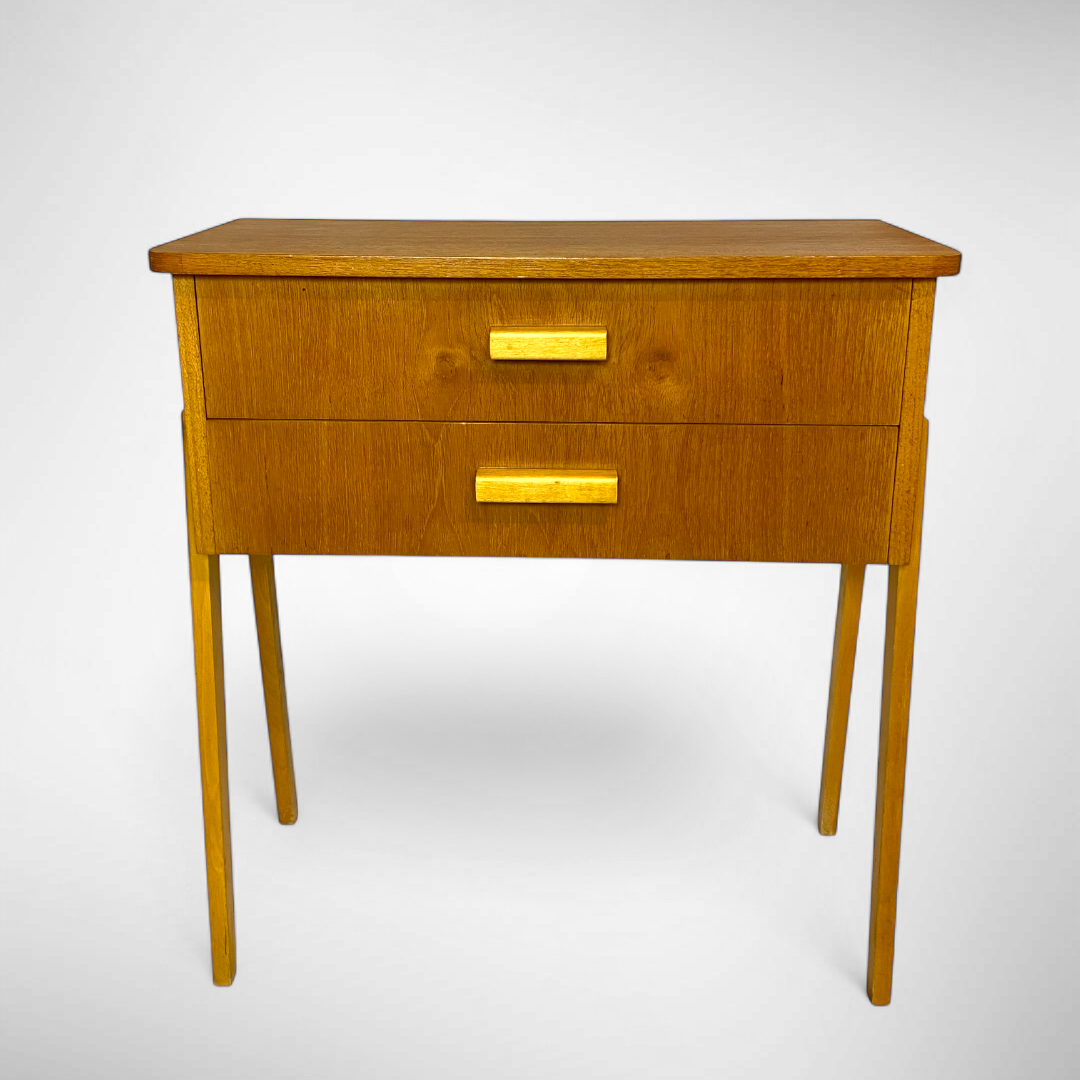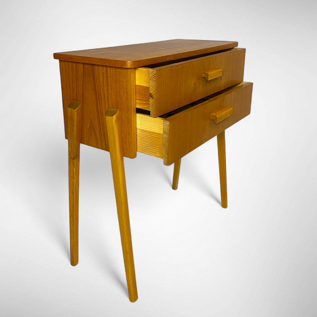 Vintage teak veneer cabinet from sweden. The cabinet has 2 drawers with cute wooden handles. This cabinet is also ideal for use as a bedside table.